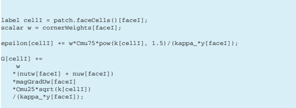 Listing 17.10 Perhitungan ε dan modifikasi produksi energi kinetik turbulensi pada sel-sel dekat dinding.
